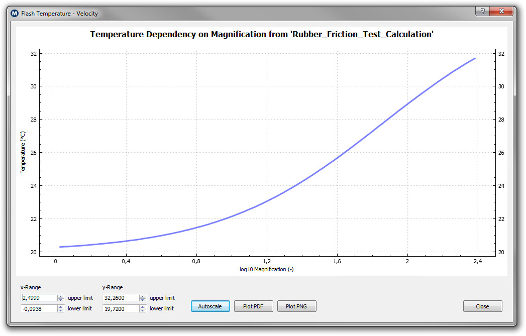 Below are two additional plots showing the dependency of the flash temperature on the magnification or resolution (with log10 as basis) on the left and the real area of contact as a function of the velocity (with log10 as basis) on the right. One can see that the rubber bulk temperature on large length scales is basically unchanged compared to the background temperature which was 20°C in this calculation. The smaller the volume element which we consider in the contact, or the larger the resolution, one can find higher temperatures at the interface.